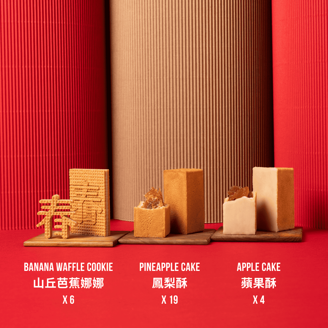 Note: Pineapple Cakes, Apple Cakes, Banana Waffle Cookies and Chocolate Fruit Cookies are halal-certified.